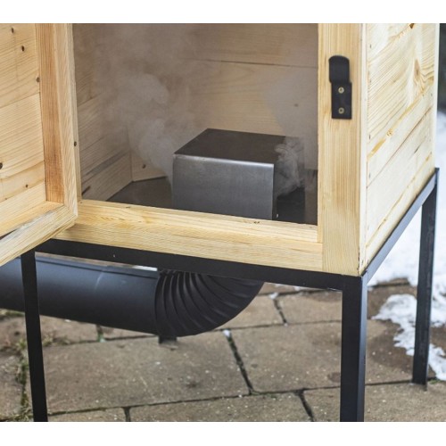 - Kompletní řešení s ohništěm: Největší výhodou této udírny je vestavěné ohniště, které eliminuje potřebu samostatného externího topeniště. To zjednodušuje instalaci i samotný proces uzení, protože zdroj tepla a kouře je přímo pod udící komorou.