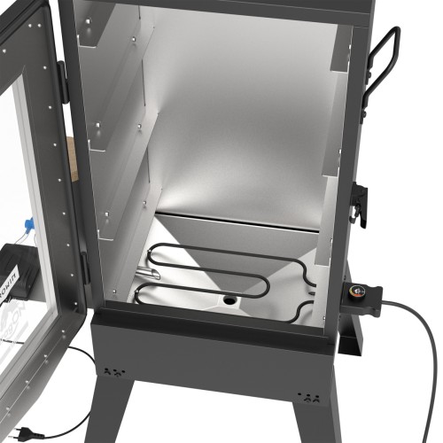 Vše v jednom kvalitním setu - velkokapacitní ocelová udící komora, stabilní kovové nohy zajišťující snadný přístup do útrob udírny, klapka, rošt, trámy a háky, udící třísky, přesný analogový teploměr, dvě odkapávací misky. Navíc generátor kouře s elektrickým čerpadlem Jet 1 LONG. Inovativní, patentovaná konstrukce tohoto generátoru kouře vám poskytne vynikající distribuci vzniklého kouře. Čerpadlo s nastavitelnou rychlostí proudění kouře je umístěno na základně tak, aby přenášelo své vibrace na válec. Tím se zabrání tomu, aby třísky při spalování visely. Speciální adaptér umožňuje snadné a rychlé připojení generátoru kouře k udírně. Výstupní potrubí generátoru je zde podlouhlé a nachází se těsně nad odkapávacím otvorem ve spodní části udírny. To znamená, že vaše uzení bude čisté a čištění bude rychlejší a jednodušší. Vyvíječ kouře pojme přibližně 450 g dřevěné štěpky. Toto množství poskytuje přibližně 3-4 hodiny. práce (v závislosti na nastavení průtoku vzduchu regulátorem čerpadla), bez nutnosti přikládání dřevní štěpky. Generátor Jet 1 umožňuje studené uzení bez nutnosti dokupování a montáže dalších konstrukčních prvků! Studený kouř vytvoříte bez zapnutí topení, pouze pomocí generátoru kouře. Touto metodou je proces uzení možný při venkovní teplotě mezi 12 a 25 °C. To vám umožní získat teplotu v komoře mezi 16-30 °C. Při dodržení těchto hodnot je celková doba uzení od 1 do 14 dnů v závislosti na očekávaném účinku a typu produktu. Při výběru varianty uzení za studena pamatujte, že udírnu neumísťujte na slunné místo. Pokyny k různým možnostem uzení (horké, teplé a studené) naleznete v pokynech.
